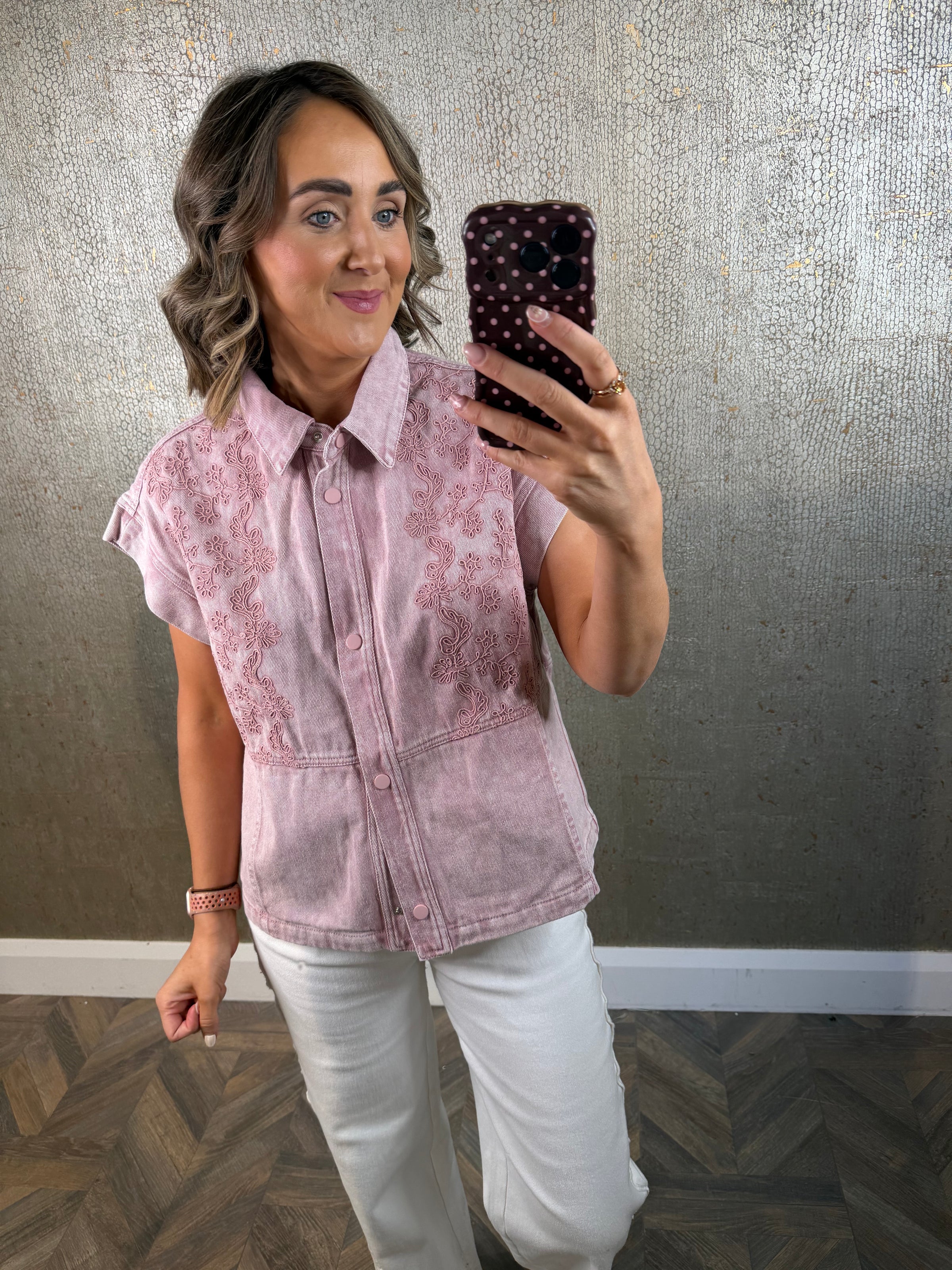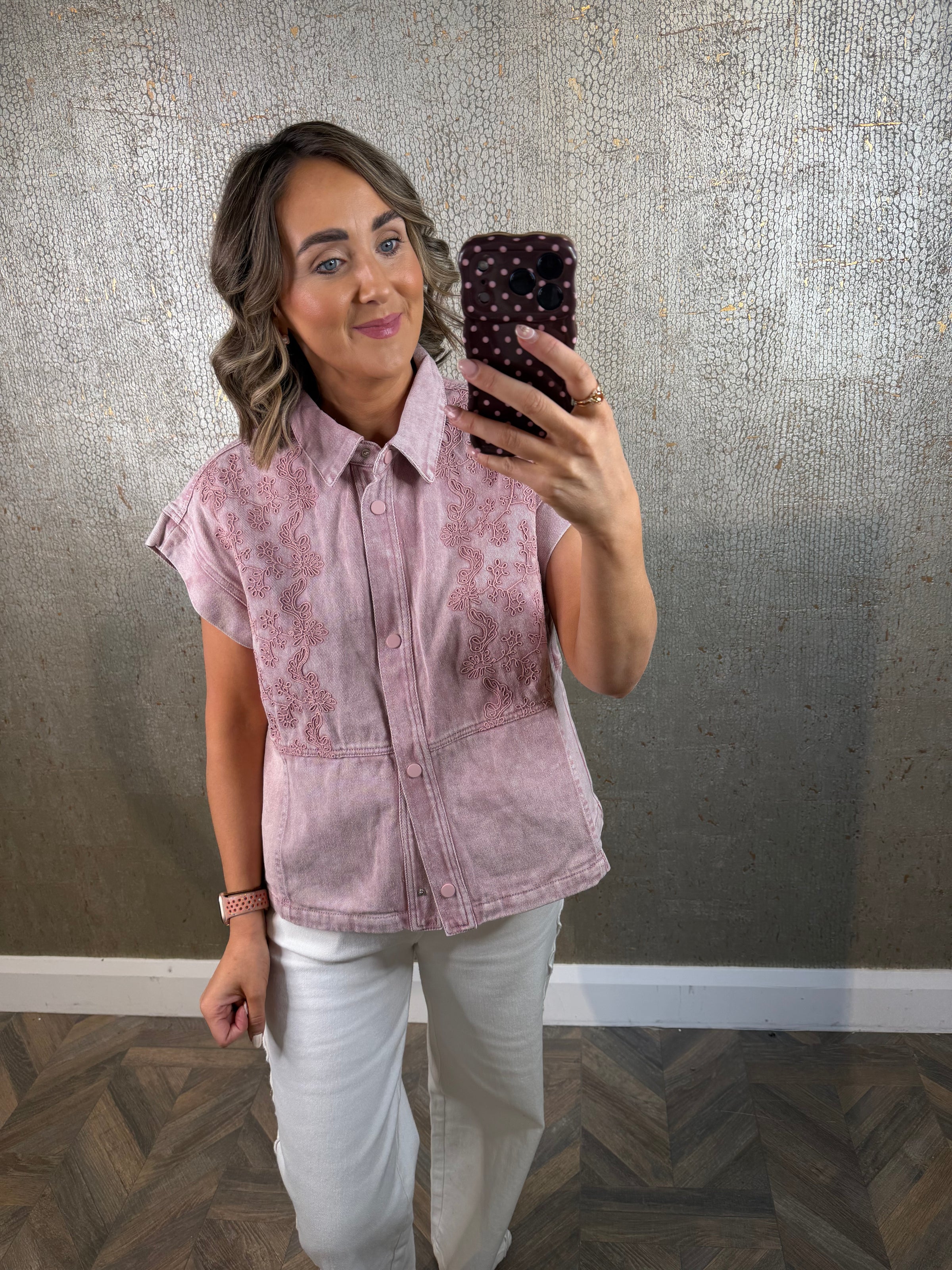 light pink floral printed denim short sleeve jacket