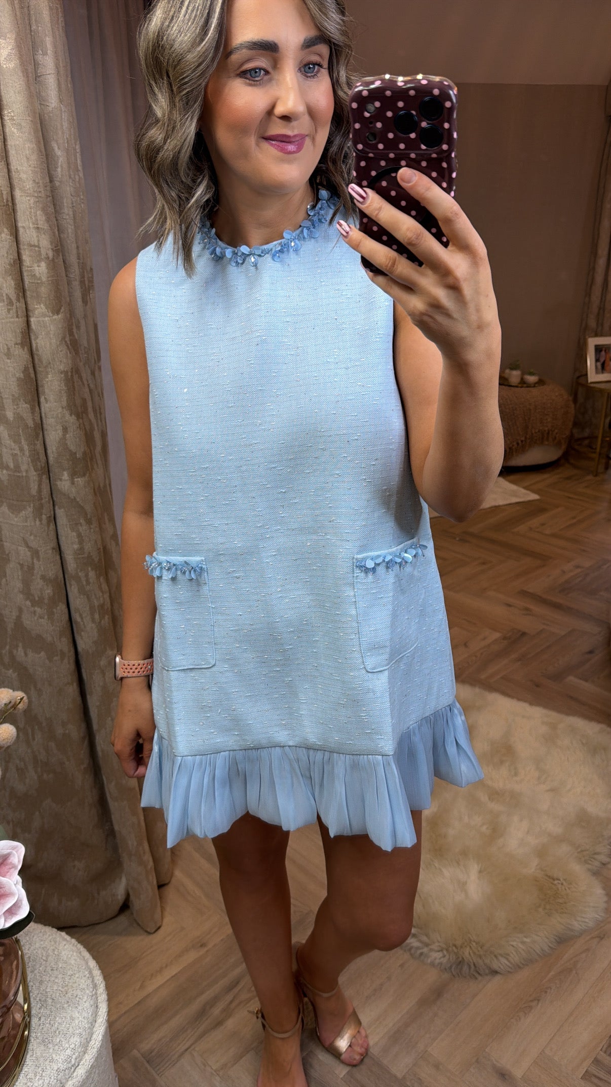 Blue mini dress with embellished collar & frill hem detail