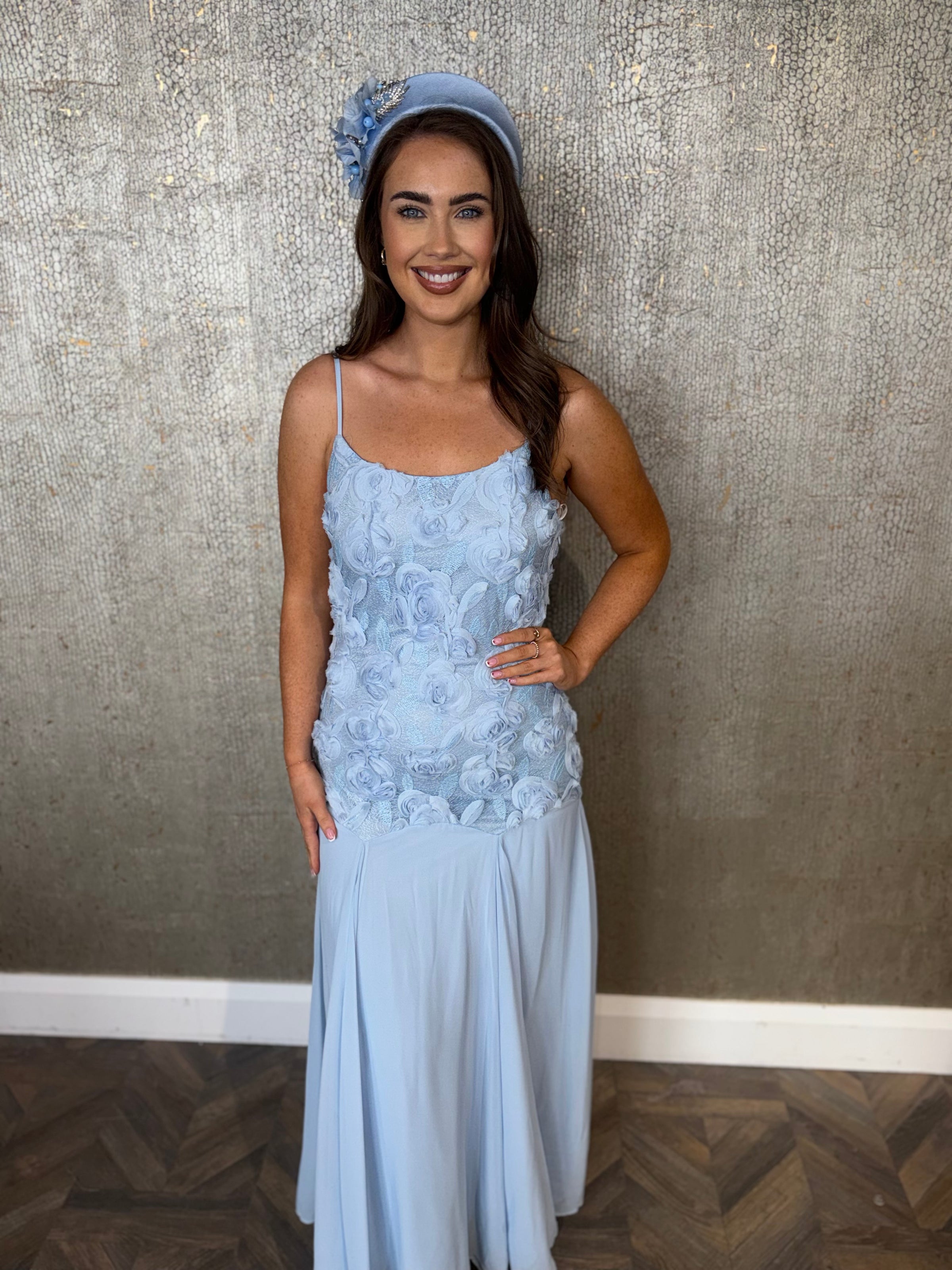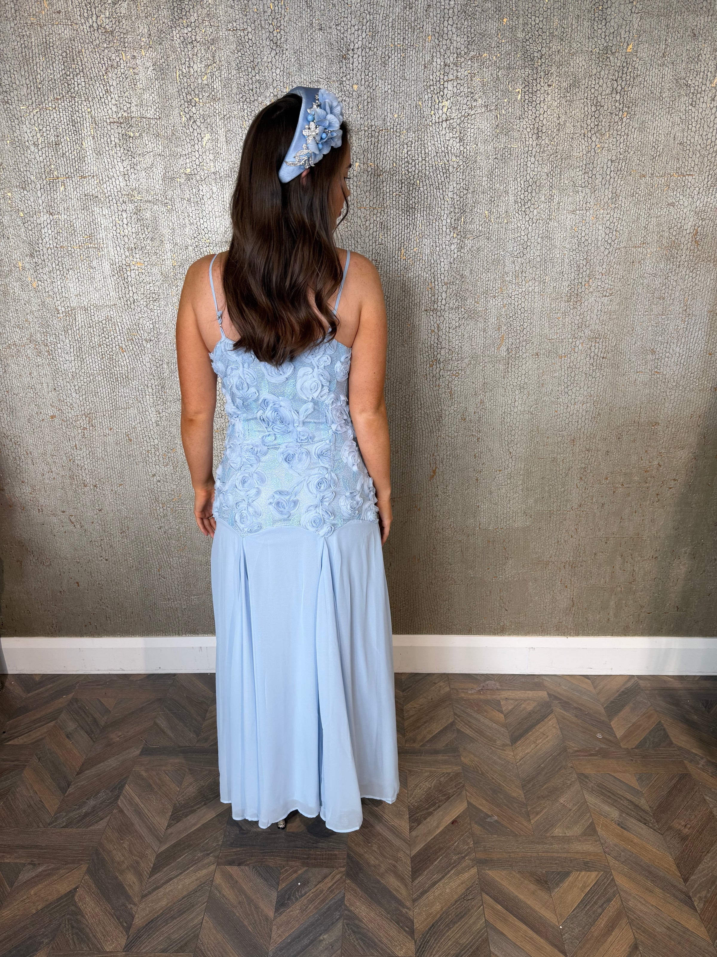 Blue dress with floral top detail & drop waist