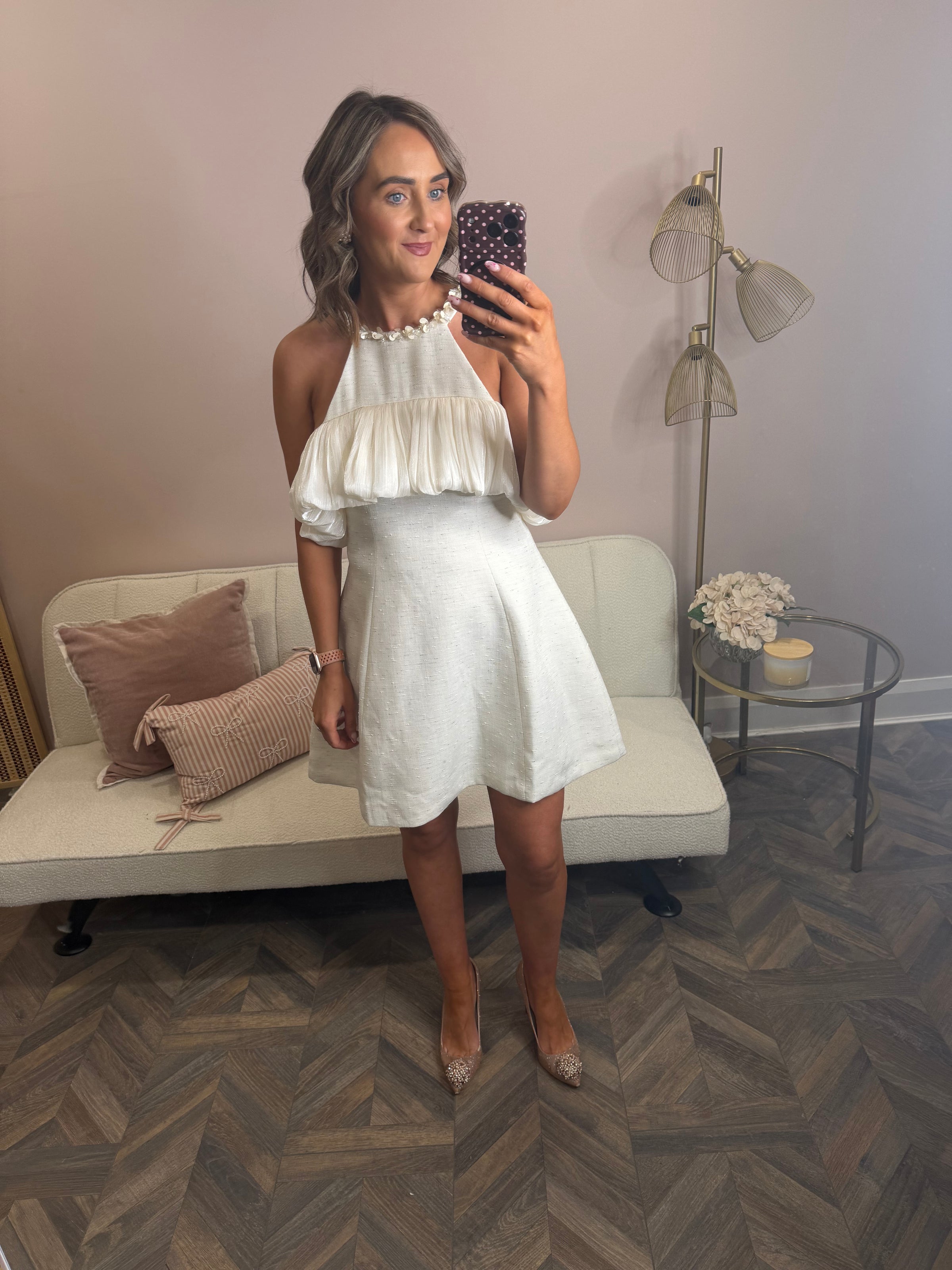 Cream mini dress with embellished collar & frill detail